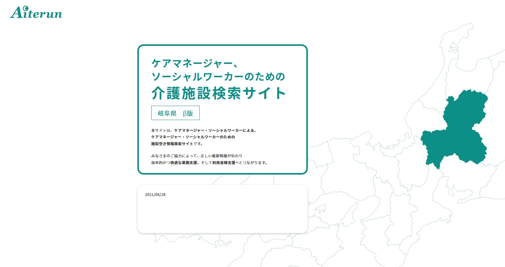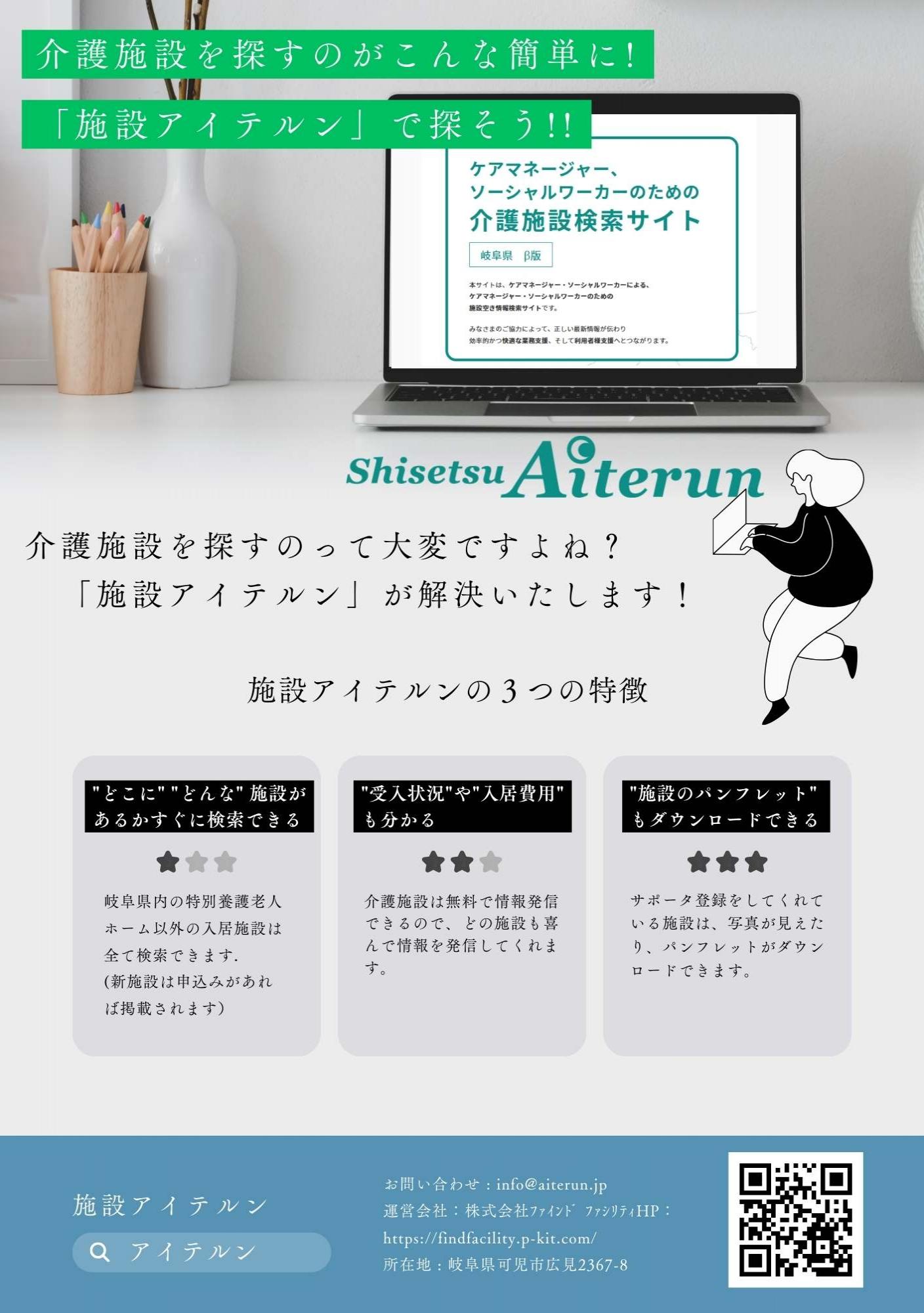 株式会社ファインド ファシリティの運営する施設Aiterun(アイテルン)は、無料で使える施設検索サイトです。岐阜県内の介護施設検索にご活用ください。